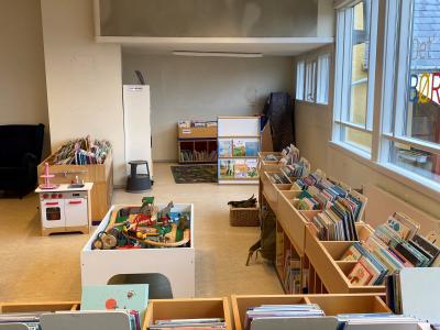 ”Undskyld, vi roder i børnebiblioteket på Aarup Bibliotek. Men du kan glæde dig til et nyt og lækkert børnebibliotek inden længe. I er stadig velkomne til at låne bøger og opholde jer i biblioteksrummet.”
